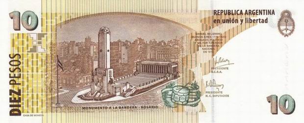 Ten Pesos - paper banknote - 10 Peso bill Back of note  |