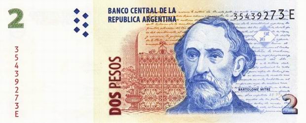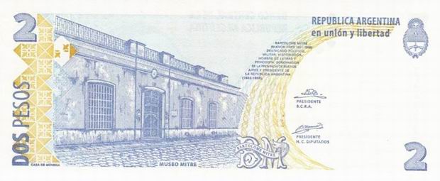 Two Pesos - paper banknote - 2 Peso bill Back of note  |